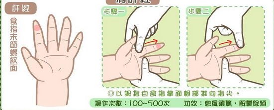 肝经位于食指末节螺旋面,以拇指自食指掌面根部推向指尖100~500次,可息风镇惊、解郁除烦。