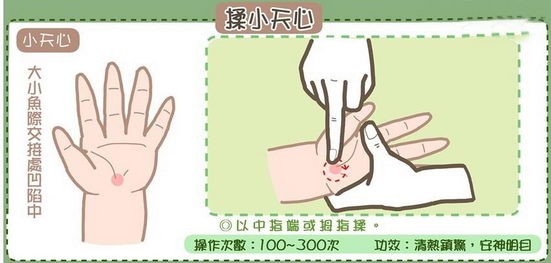 小天心位于大小鱼际交接处凹陷中,以中指端或拇指揉100~300次,可清热镇惊、安神明目。