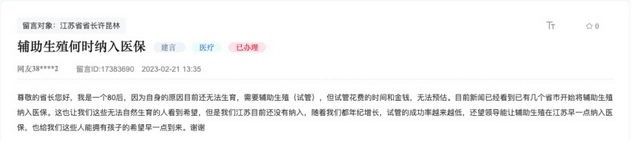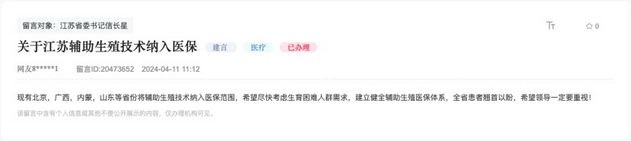 一段时间以来,人民网“领导留言板”上多位网友留言,建议江苏省将辅助生殖医疗费用纳入医保提上日程。