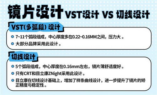 CRT和目立康ZNight采用了切线设计。这一设计镜片更薄,配戴更舒适更安全。且镜片与角膜更贴合,使镜片在夜间配戴时能够牢牢定位,矫正效果更为理想。