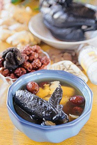 乌鸡洗干净汆水,切大件,将所有材料洗净,放入炖盅炖3小时,落盐即可饮用。