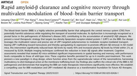 研究团队特制的纳米粒子针对的是一种名为LRP1的关键蛋白质,LRP1是血脑屏障中的“分子守门人”,它可以识别淀粉样蛋白-β,与其结合,并将其运送穿过血脑屏障进入血液,然后在血液中将其清除。然而,在病变模型中该系统可能会发生故障,从而导致β淀粉样蛋白在大脑内部积聚。此时,纳米粒子就像一个“开关”,能够重启大脑中这一清除系统。