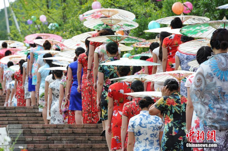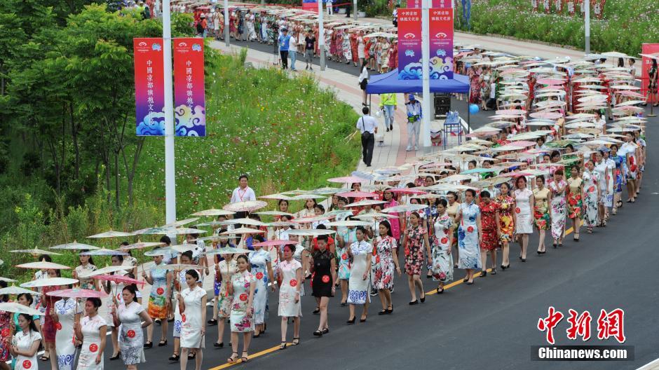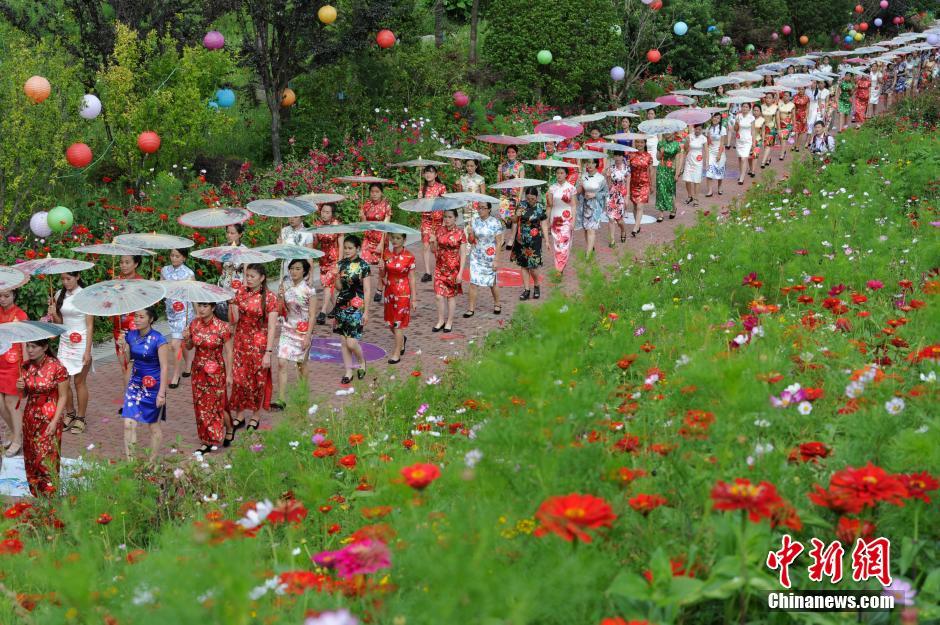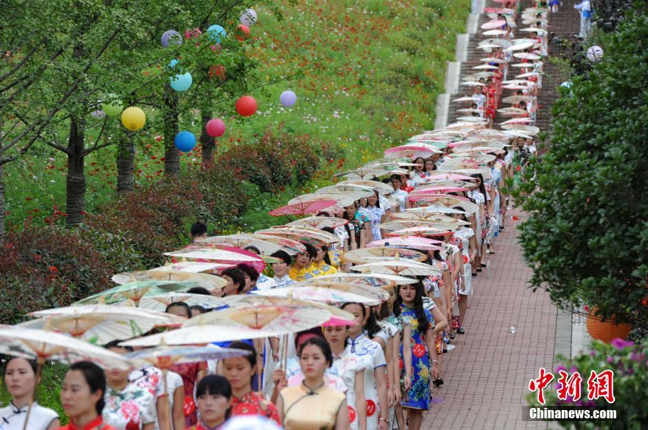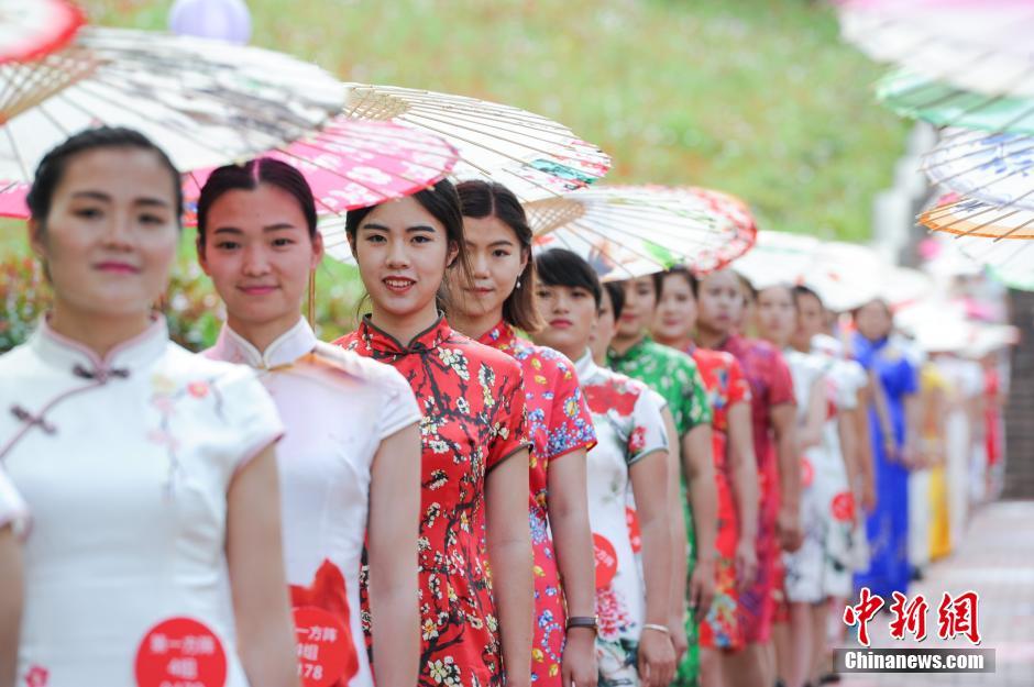 7月29日,旗袍佳丽在走秀。当日,中国凉都旗袍文化节在贵州省六盘水市举行,3000余名来自全国各地的旗袍佳丽在六盘水明湖湿地公园长达1.13公里的景观桥上走秀,构成目前现场参与人数最多、延绵距离最长的世界旗袍秀。中新社记者 贺俊怡 摄