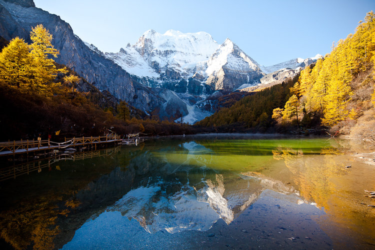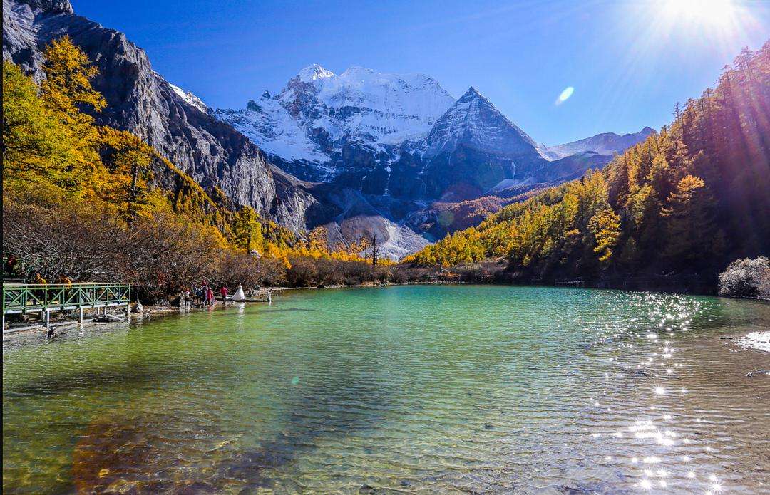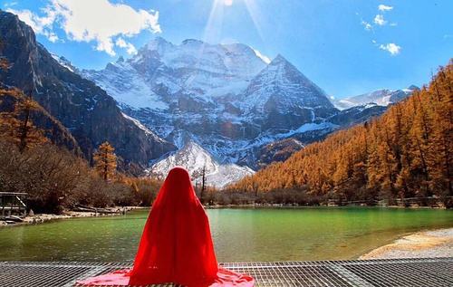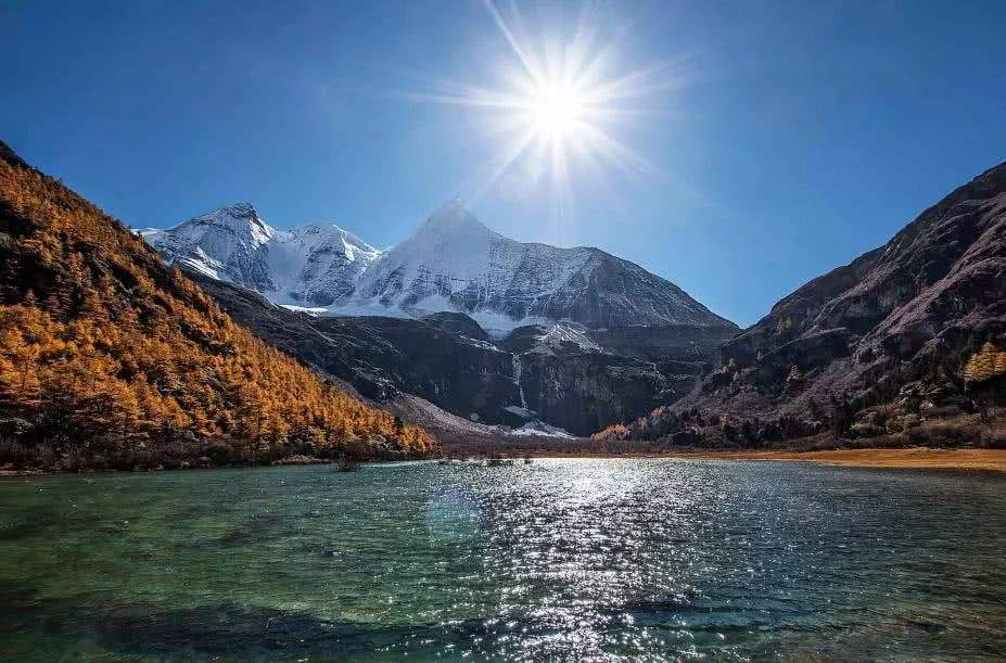 秋天的稻城是最迷人的,“秋叶与雪峰相拥,碧水共长天一色”是对它最好的描述。