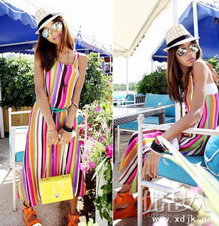 肤色太黑的女生总是不敢穿太艳丽的颜色,但是这款如彩虹一般的色彩搭配,绚烂的色彩,背心款式的设计,露出性感的手臂和脖颈,很有性感夏日的味道。不仅没有露出缺点,反而将深肤色衬托的更加健康和时尚。