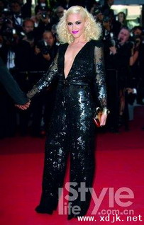 这件亮片连身裤存在感极强,深V领与透视袖管火辣性感。复古的发式,烟熏眼妆,荧光色红唇也相得益彰。这个复古冶艳妖姬的造型一定是红毯上最亮眼的风景!