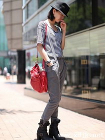 高圆圆干净利落的装扮让人眼前一亮,色彩丰富的邮差包突显了整体造型的亮点,中性风格的小礼帽为造型平添一丝趣味感,T恤+窄口长裤的搭配不但型格十足,更彰显出细节化的层次感。