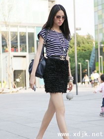 用长项链来为造型增加延伸性,卷起的袖口显得俏皮可爱,用条纹T恤来搭配半身裙略显暗沉的色调更能体现张梓琳的活泼气息及时髦味道。