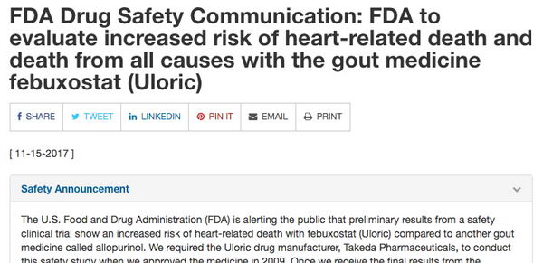 大部分人吃药,都是听医生的,或者听别人的推荐,现在又多了一个途径,在网上搜,很少有人仔细去看说明书,因为又长又看不懂。于是问题来了,一个在网上到处都是好评的药,近两年却不断被各国药监部门警告。前些天,看到了11月15号FDA(美国食品药品监督管理局)发的警告,非布司他可能增加心血管死亡的风险,这是啥情况?搜了一下又发现WHO(世界卫生组织)、加拿大的药监局也发布过类似的警告,我们国家的药品安全监测网站也转了,不禁有点懵,不是说很安全么?