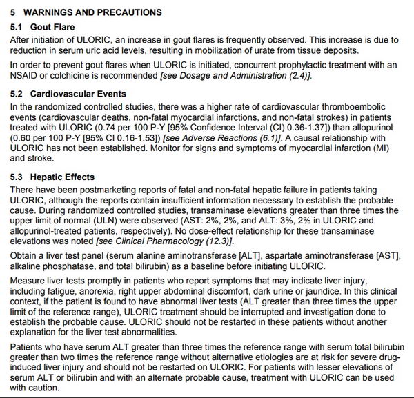 以前在贴吧里还有人问非布司他说明书里为啥说不适合无症状的高尿酸患者?好多患友都说是用非布司他来降尿酸反而会诱发痛风,其实就是说明书注意事项里的第一条(英文的5.1),但其实所有降尿酸的药降得太猛都会有风险,可是现在看起来应该还有其他原因,一个是心脏、一个是肝,都可能有风险。