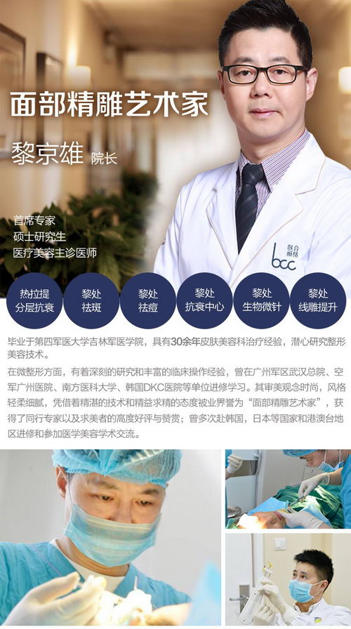 黎京雄院长毕业于第四军医大学吉林军医学院,具有30年以上皮肤美容科治疗及管理经验,潜心研究整形美容技术。在整形方面,有着深刻的研究和丰富的临床操作经验,擅长面部微雕(自体脂肪及线雕),激光美容,综合祛斑、嫩肤除皱、痤疮综合治疗、色素性疾病、黄褐斑、褐青色痣、太田痣、雀斑、血管性疾病等以及敏感性肌肤的治疗。