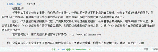近日,“40岁癌症叔叔”事件在网上引起极大的关注,一条《跪求抗癌方法!刚过40岁生日叔叔被诊为“胃癌”,悲痛慌乱中……》的简短求助帖在天涯引来了近30万的点击,回复2000多条,面对孝心网友情真意切的求助,网友纷纷建言献策,国内防癌第一品牌葆盛口服液亦于5月27日现身,承诺将免费赞助40岁癌症叔叔1年的葆盛口服液,自此事件再度升级,此举引来网友普遍赞誉的同时,也受到部分网友的质疑,更有回帖称此事前后疑似有专业炒作团队操刀,其目的不得而知。