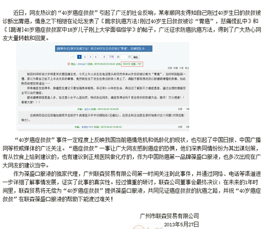 从葆盛口服液官方网站(http://www.gzliansen.com/NewsView.asp?id=43)上可发现,5月27日发布了《联森将免费赞助“40岁癌症叔叔”葆盛口服液 》,具体内容如下: