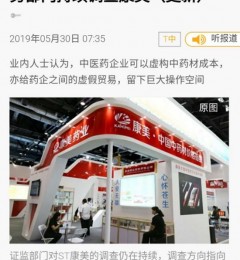 5月30日,财新发布名为《独家|涉嫌虚开增值税发票 康美药业遭税务稽查》报道称,因涉嫌虚开增值税发票,康美药业于5月下旬被税务部门立案稽查。目前稽查仍在进行中。业内人士认为,中医药企业可以虚构中药材成本,亦给药企之间的虚假贸易,留下巨大操作空间。...【浏览全文】