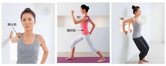 站姿手叉腰,手扶椅背或矮柜等,肘呈90度,用八字带固定肩关节后,做半蹲的动作,会伸展到腋下和前胸并强化后背的肌肉。