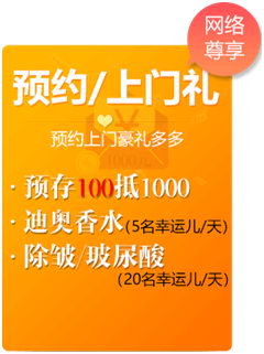 ①预约上门,韩妃超值好礼疯狂送,dior品牌香水、除皱、臻品玻尿酸等你抢②上门前预存100元,预约金10倍抵用