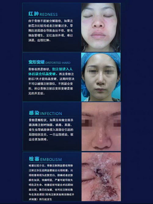 注射骨粉后,因为骨粉的特性,容易出现感染、变形变硬、排异反应等不良反应,甚至导致栓塞,如果已经确定自己注射的是骨粉,不论有没有出现症状,都需要尽早取出,相对来说,取出的越早,对身体影响越小,取出约容易。