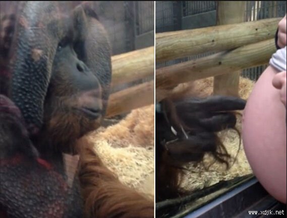 今年1月时,在英国埃塞克斯的科尔切斯特动物园上演了这样一个暖心的场景:一只猩猩流着泪透过玻璃温柔亲吻一个孕妇隆起的肚子。这只猩猩叫Rajang,而20岁的Kayley Bettany当时正与21岁的丈夫Kieran参观动物园。