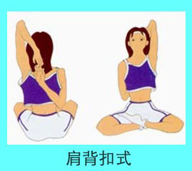 方法:简易交叉坐,左臂屈头后,右臂屈背部。左右手相扣,背伸直,保持3—5个呼气。呼气缓慢。换另一侧相同。