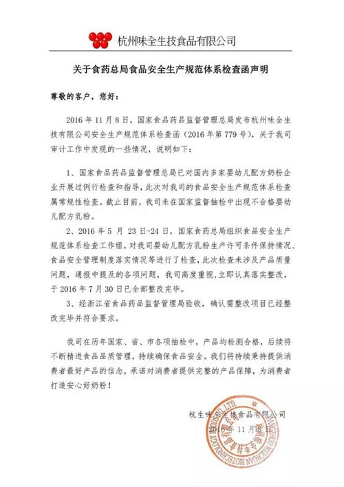1、此次食品安全生产规范体系检查属常规性检查。此前,我公司未在国家监督抽检中出现不合格婴幼儿配方乳粉的情况。