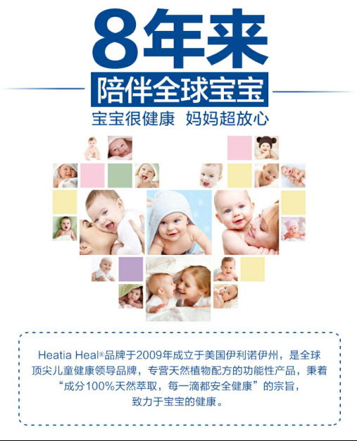 8年来,美国Heatia Heal呵护全球宝宝健康,我们的每一个产品都提取自天然植物,因为安全、纯天然,受到国内外妈妈的热烈追捧!