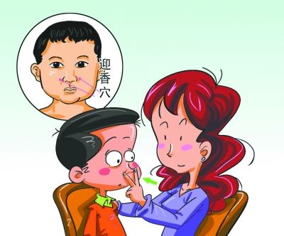 许多孩子一到冬天稍遇风吹草动,鼻下便见两条“青龙"摆尾,每天揉迎香穴20-30遍可预防鼻炎。