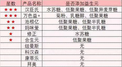 益生元的种类有很多,目前公认效果最好的益生元叫低聚果糖。因此,小编给几个主流品牌做了一个评分供宝妈们参考:添加低聚果糖同时还有2种以上辅助添加的得3颗星,添加低聚果糖同时还有1种辅助添加的得2颗星,而其他没有辅助添加的得1颗星,没有添加益生元的则没有得分。经过评比,这轮万色城的万色益+和汉臣氏的产品比较优秀。