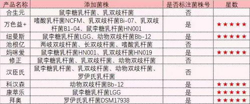 通过卫生部颁布的名单可以看出,只有以上6种菌株益生菌可以用于婴幼儿食品。如果益生菌未标注菌株号,仅仅标注了菌株,则不能说明其可以适用于婴幼儿。比如乳双歧杆菌有很多种菌株,而只有HN019和Bi-07可以用于婴幼儿食品,其他则不能。所以未标注菌株号的益生菌给婴幼儿服用是有风险的。因此,小编又做了一个图让宝妈们清晰的看一下各大品牌的情况,没有标注菌株号的益生菌不能得分(安全性不能确定,实在是不能给分)。而标注了菌株号,而且在卫生部规定名单内的得5颗星。从图中显而易见的是万色城的万色益+益生菌选用的菌种丰富,并且标注了株号。