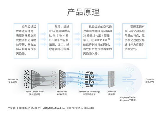 那么多种净化器怎么区分好坏?拼的是什么?我个人认为拼的就是滤网。在这里简单的介绍下咱家这款净化器的滤网,总共三层,貌似跟大多数净化器一样哈。第一层是活性炭过滤网,吸附空气中导致气味的气悬微粒,如甲醛、烹饪气味以及烟味等在内的气态污染物。然后,被吸入的空气将被第二次HEPA过滤网器隔除99.97%的微尘,小少至0.3微米的尘粒、细菌、过敏原、病毒也会被消除。最后来到第三层,这第三层也就是上面提到的我个人认为很奇葩的设计,很多网友称之为黑科技—— 婴睡带技术(Diffuser Technology)。那啥是婴睡带技术啊,我在此借花献佛综合下说明书的内容:1. 当洁净后的空气经过婴睡带再输出的同时产生AirsphereTM效能,就犹如一个“金钟罩”护体般,有效隔挡外来空气中的有害污染物入侵,为婴幼儿做到全方位的防护;2. 采用德国先进的风扇及马达技术,若使用静音模式时,音量可低达39.8声功率(dBA),不会影响睡眠素质,实现了静音工作。
