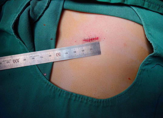首先,结合达拉斯肋软骨多重定位法,精 准定位肋软骨位置后,仅仅只有1-1.5cm的微创切口,大大缩小疤痕宽度、缩短创口恢复期。